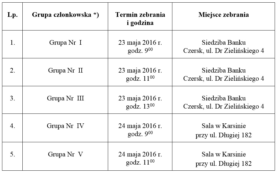 *) Każdy Członek Banku Spółdzielczego w Czersku otrzymał pisemną informację o przynależności do danej Grupy w roku wyborczym 2014. Ponadto informację o przynależności można także uzyskać osobiście w sekretariacie Zarządu Banku przy ul. Dr Zielińskiego 4 w Czersku.