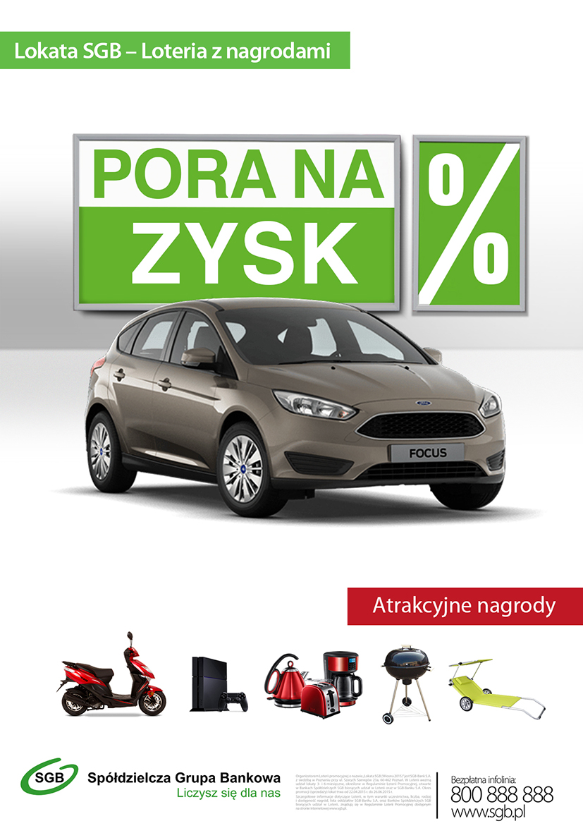 – lokata 6-miesięczna – 1,75 % - Zakładając „Lokatę SGB (Lato 2015)” możesz wygrać jedną z nagród:
