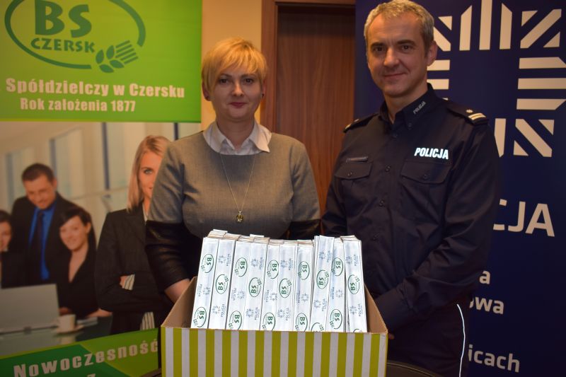 W dniu 03 marca br. Wiceprezes Zarządu Banku Spółdzielczego w Czersku, Iwona Sabiniarz, przekazała na ręce Zastępcy Komendanta Powiatowego podinsp. Tomasza Kąkolewskiego opaski odblaskowe, które w ramach policyjnych działań profilaktycznych trafią nie tylko do najmłodszych mieszkańców powiatu w trakcie pogadanek o bezpieczeństwie na drodze, ale także do starszych uczestników ruchu drogowego. Prowadzone przez Policję akcje mają przyczynić się do zwiększenia bezpieczeństwa pieszych oraz zminimalizowania ilości wypadków z ich udziałem.