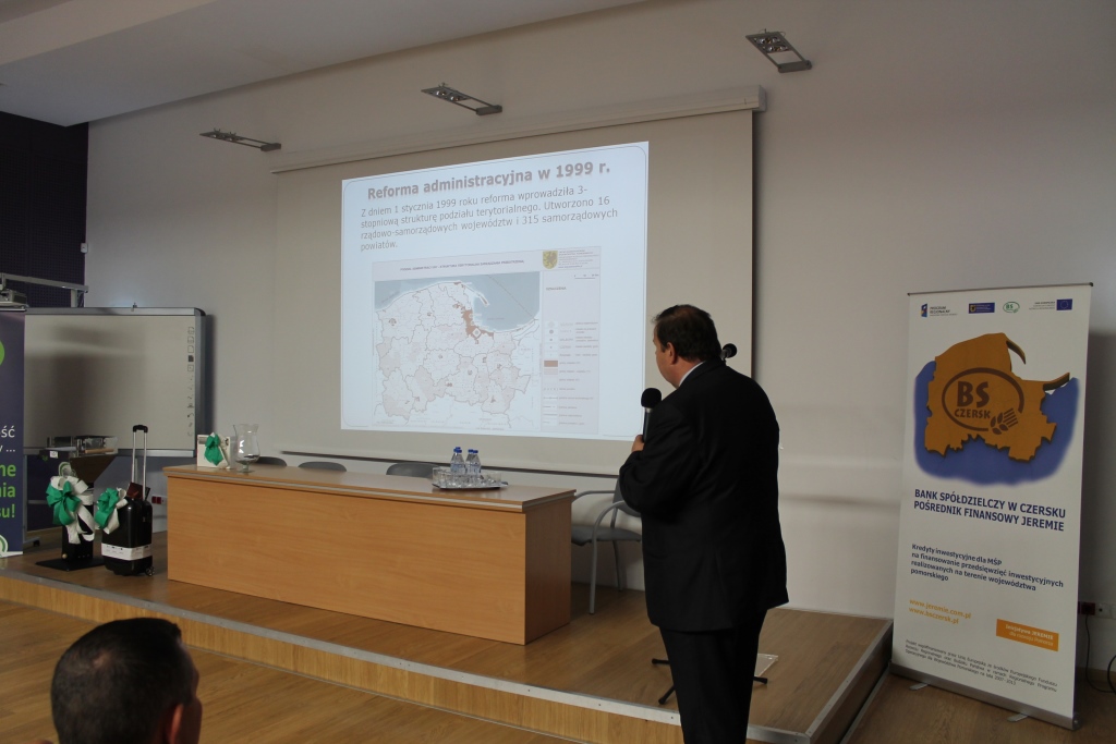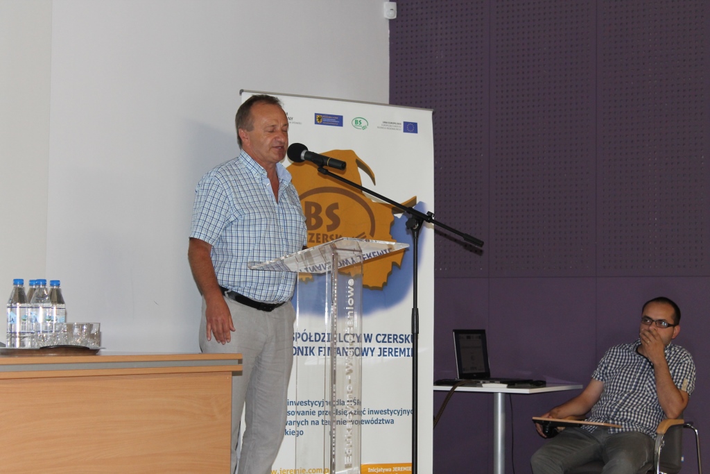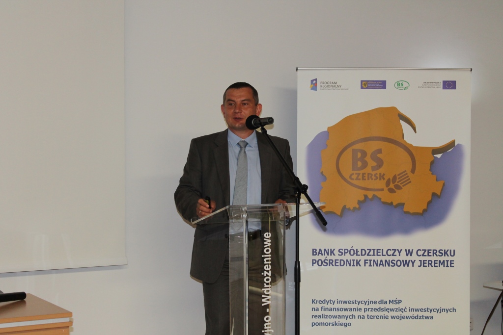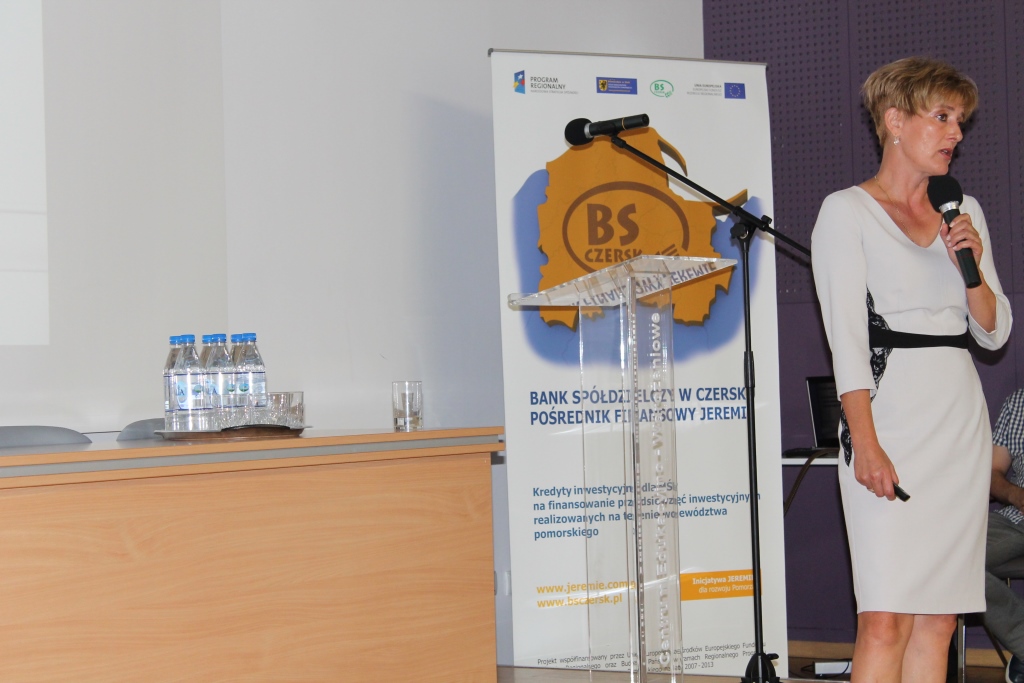Bank Spółdzielczy w Czersku, jako jedyny wśród banków spółdzielczych na całym Pomorzu, przystąpił do unijnejInicjatywy JEREMIE. Dzięki temu może udzielać kredytów inwestycyjnych JEREMIE na preferencyjnych, bardzo atrakcyjnych warunkach, a niewielkie koszty odsetkowe, generowane przez pożyczki ze wsparciem unijnym, zachęcają właścicieli firm do aktywnego inwestowania w rozwój przedsiębiorstw. Niewątpliwie, jest to prawdziwa „perełka” w ofercie kredytowej Banku Spółdzielczego w Czersku. Bank od ponad dwóch lat aktywnie popularyzuje pozadotacyjny program finansowego wsparcia dla firm. W ramach unijnej Inicjatywy JEREMIE, do której przystąpił w 2012 roku, udzielił już blisko dwustu nisko oprocentowanych kredytów inwestycyjnych pomorskim przedsiębiorcom, rozdysponowując w sumie ponad 20 mln złotych. Doskonałym uzupełnieniem oferty kredytowej organizatora spotkania była propozycja jednego z partnerów BS Czersk, a mianowiciePomorskiego Regionalnego Funduszu Poręczeń Kredytowych Sp. z o. o. Aktywna współpraca Banku z PRFPK, zapewnia możliwość zabezpieczenia kredytów zwłaszcza firmom młodym, rozwijającym się, które nie dysponują jeszcze wystarczającym majątkiem, o czym treściwie i wyczerpująco mówiła Irena Wróblak (Prezes Pomorskiego Regionalnego Funduszu Poręczeń Kredytowych Sp. z o. o.).